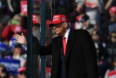Republican presidential nominee former President Donald Trump measured the thickness of the bulletproof glass as he visits at a campaign rally in Lititz, Pa., Sunday, Nov. 3, 2024.