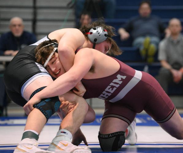 Manheim Central's Noah Templin takes on York Suburban's Gehret Gentzyel In their 189 pound fifth place bout during the District 3 class 3A South central Regional championships at Spring Grove High School on Saturday Feb. 22, 2025.