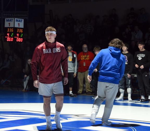 Manheim Central's Brodie Daugherty walks off after shaking hands with Waynesboro's Anthony Ausherman before their 215 pound finals bout during the District 3 class 3A South central Regional championships at Spring Grove High School on Saturday Feb. 22, 2025.